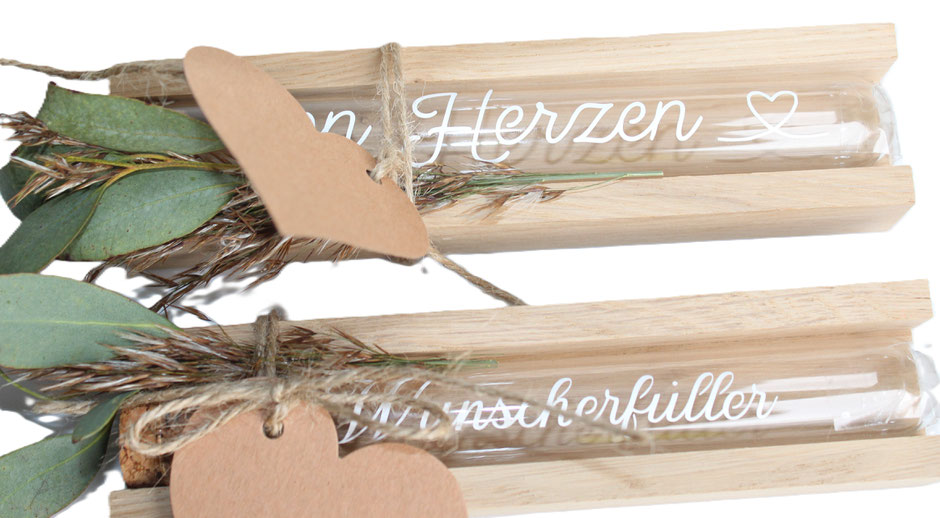 Diese tollen und robusten Gläser mit Korken sind beschriftet mit "Wunscherfüller" oder "Von Herzen" und mit einem kleinen Kärtchen versehen. Sie liegen in einer Einfassung aus Eichenholz und sind mit Trockenblumen verziert.
